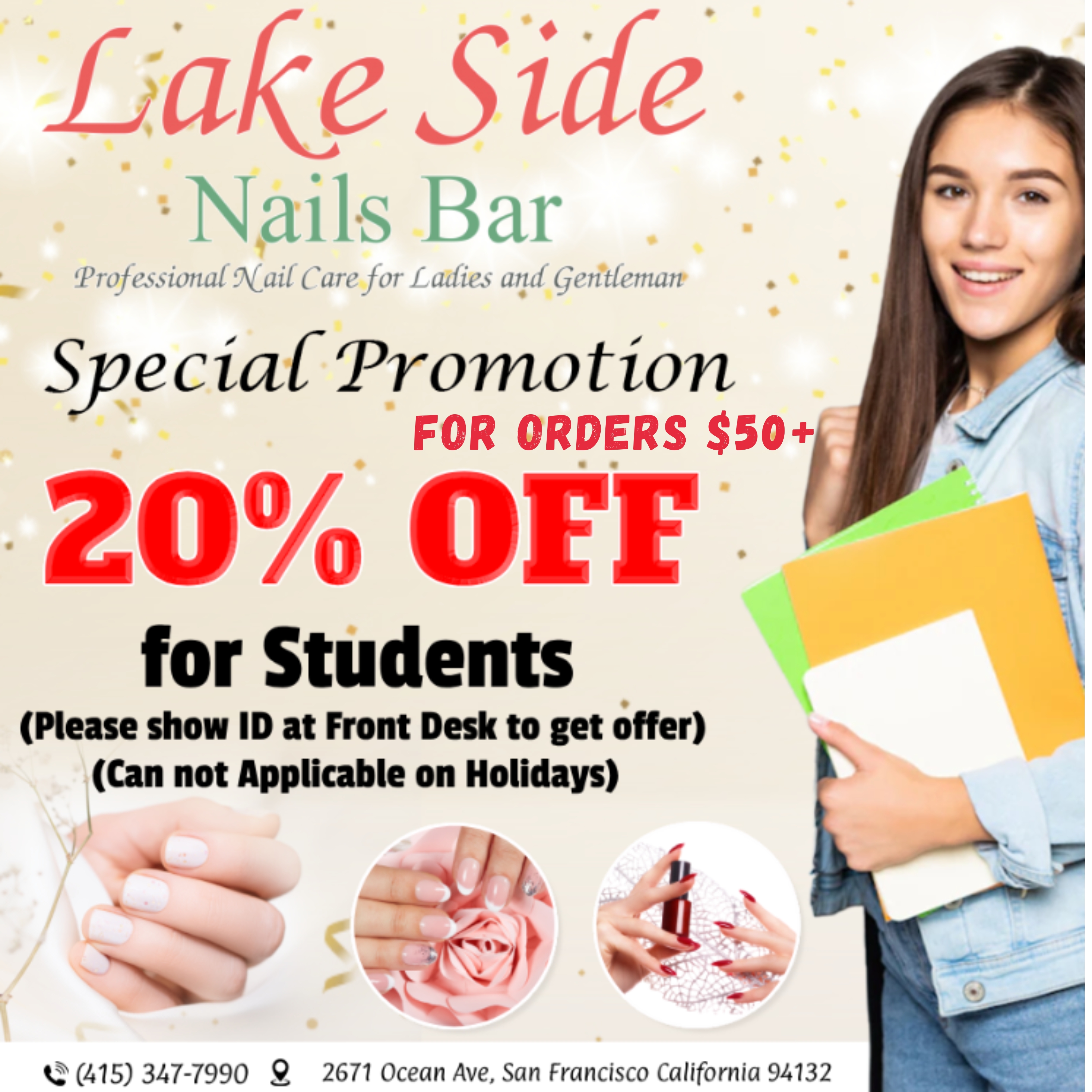 Located in a beautiful place in San Francisco, CA, zip code 94132, Lake Side Nails Bar offers you the ultimate in pampering and boosting your natural beauty with our whole-hearted, creative & professional staff. We guarantee to provide excellent services, especially catching up with new trends in nail & beauty care industry. Whether you would like to do a simple Manicure & Pedicure or look for a stylish nail design, you are in the right place! All the technicians at Lake Side Nails Bar are willing to hear your needs and deliver the best services that you deserve to!